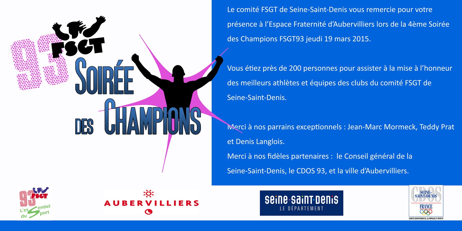Le comité remercie une nouvelle fois tous les acteurs qui ont contribué à la réussite de cette soirée de gala : les sportives et les sportifs, les équipes récompensés, les entraîneurs, les dirigeants, les commissions départementales d’activité, la ville d’Aubervilliers, le Conseil général de la Seine-Saint-Denis, le CDOS et nos trois prestigieux parrains : Jean-Marc Mormeck, Teddy Prat et Denis Langlois.